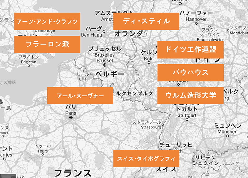 今回は西洋の美術と日本の美術、つまり西洋と東洋の美術の違いにも触れていきながら進めていきます。ヨーロッパ大陸に近代造形運動の名称をマッピングしました。ドイツ工作連盟、ディ・スティル、アール・ヌーヴォー……などなど。主要な近代造形運動は、こうして見ればヨーロッパのごく一部のエリアで発生していることがわかります。それらがグローバルスタンダード的な性格をもって定着していくわけですよね。では、日本ではどういったデザイン運動や造形運動があったか紹介します。