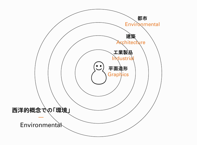 それは、図式化するとこういう形なんです。自分自身が真ん中にいるとしましょう。その周りにいわゆる平面、情報領域のものがあって、次に工業製品が領域にあって、建築があって、都市があってという、同心円的に広がっていくような図のようなイメージができます。自分の周りがこうやって拡張的になっていく考え方とも見ることができる。