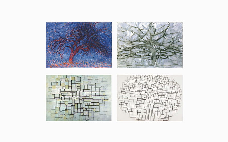 ピエト・モンドリアンの有名な絵画です。まさにモダニズム的。ここに至る過程というのをモンドリアンはまめに残していて、最初は印象派的に描かれていたリンゴの絵画が、だんだん濾過されて抽象化されていった変化の様子がわかります。工業化の時代とか国際化の時代になると、純粋なものへの憧れというのが出てくるんですね。純度が高い方がいいという価値観がこの頃にはすでに出てきているんです。実は意外にも、15世紀に出版されたアルベルティ『絵画論※1』にも、面の上に点、その点が移動して線になり、というくだりがあります。その面の上に点という考え方がすでに、西洋らしい単純化の仕方だとも思いますが、そういうところから引き継いだ文脈があるということですね。