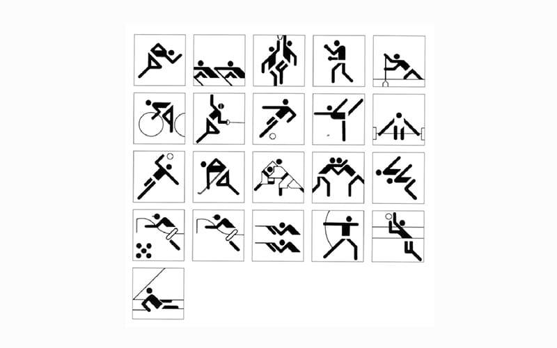 バウハウスに続いて、戦後のドイツではウルム造形学校が設立されます。バウハウスにも携わったマックス・ビルを学長にし、設立者はオトル・アイヒャー。ここのデザインというと、まずはこのブラウンのラジオです。これは1960年代のデザインだったと思いますけども、ほぼiPodともいえるような形になっていますよね。グラフィックスでは、ルフトハンザ航空のものとかが出てくるんですけども、ここまでくるとさすがに古さを感じさせないくらいの印象です。オトル・アイヒャーは、ミュンヘンオリンピックでピクトグラムをつくりました。これは我々が駅でトイレを見つけたりするときなどに頼りにしているものですけども、こういうものがどんどんブラッシュアップされていくわけです。