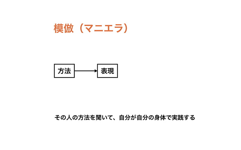 この本を参考にするとき、ふたつの態度があると思います。ひとつは実践書として模倣する態度。端的に人の方法を聞いて実践するというもの。つまり、方法を知識として取り入れて実践する態度。これがこの本を実践書として使ってしまう心理じゃないかという気がします。