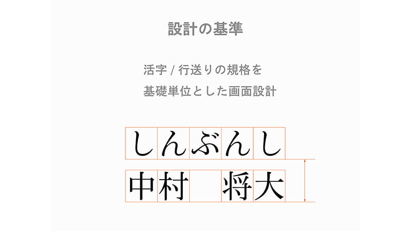 では、こうした垂直・水平方向の分割においてなにを基準にすればいいのか? それが規格化された文字である活字です。まさにタイポグラフィに内包される規格基準をもって、画面を制御してゆきます。12ポイントの倍が24ポイント、12ポイントの半分は6ポイント……というように活字は数値により明快に管理することができます。たとえば12ポイントのサイズで「中村 将大」と組むとする。すると、あいだにある余白、全角スペースもまた12ポイントになります。これは文字と余白が同じ基準のもと等価に扱うことが可能ということになります。