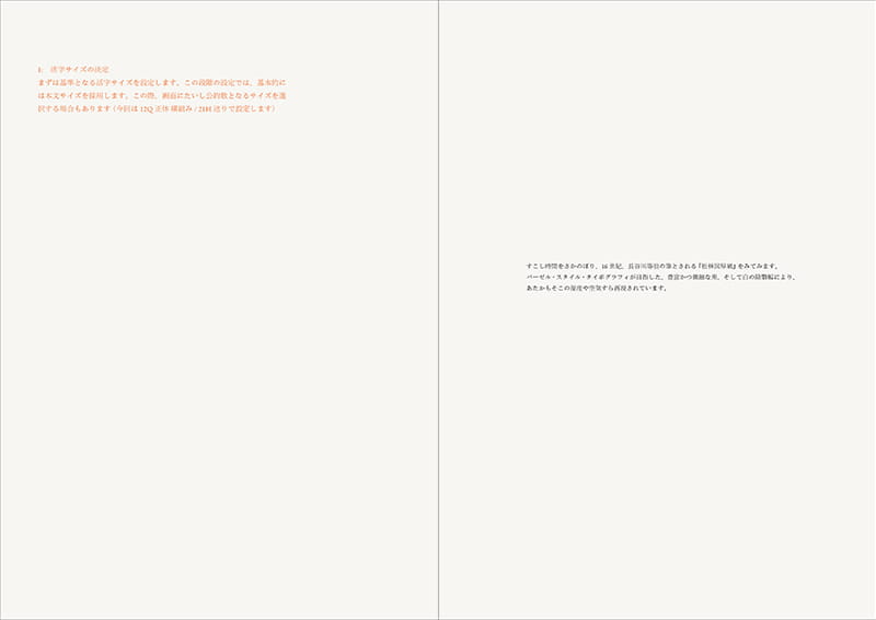そのとき基準となる活字と行のサイズというのは、基本的には本文の設定でおこないます。作例をみてみましょう。縦位置A4サイズの見開き——つまりA3横位置——の画面に、横組みで設定するとします。実際はこの基準となる本文の設定をいかにするか、そこがもっとも心を砕くところなのですが、ここではひとまず基準となる活字サイズが決まっているということにします。