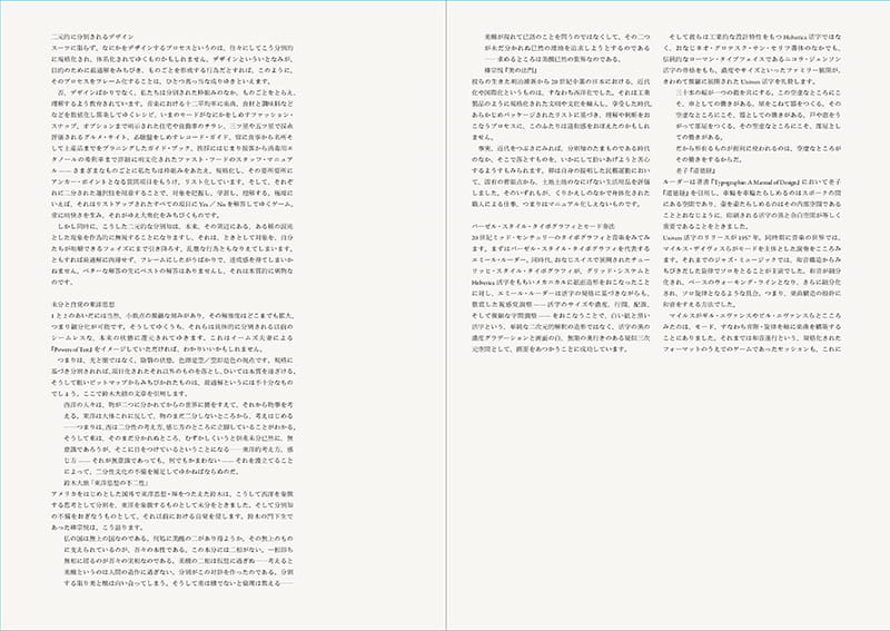 印刷術は活字を置いていくので、欧文であればそれが自然と横に伸びていきます。そして行としては、縦に積み重ねられていくという、縦横の力学がある。これが絶対の公理で、それが無限に形成されていく宇宙だと。こんな言われ方がされることもあって、タイポグラフィを考えることは自ずとグリッドを考えることになっていきます。紙面はサイズが決まっているので、グリッドを微分的に割って導きだしていくと、一応限界があるわけです。もうひとつのみかたとして、文字を積み上げるように導きだしていく方法がある。これは微分に対して積分という感覚で、この両方の視点でつくっていくものがグリッドだといえます。