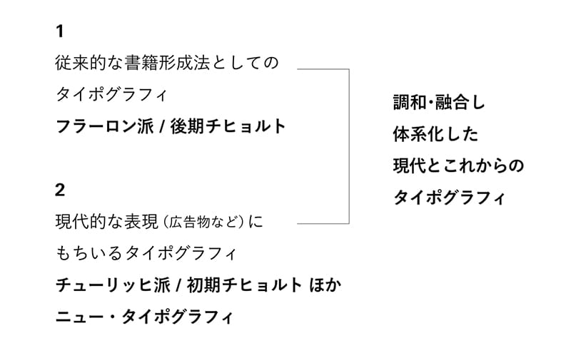 1:従来的な書籍形成法としてのタイポグラフィ 2:現代的な表現(広告物など)にもちいるタイポグラフィ