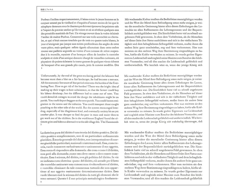 とはいえ、ここでユニヴァースやメリディエンを無批判に礼賛したり、あるいは発生した国の活字書体をつかえ、というような厳格めいたはなしは、あまりに早急すぎますし、ナンセンスです。そればかりが活字書体の選択基準にはなりえないでしょう。しかし、活字はながい時間のなかで、どうしても言語や地域風土に最適化されるものであるというのは、間違いないようですし、それはかんがえてみれば当然のことかもしれません。その背後には最適化されるほどの時間があり、それがゆえ今日もなお残るもの。