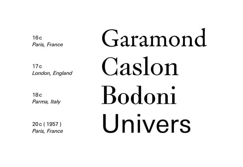 また、一概にサンセリフ体といっても、つぶさにみればその傾向は推移します。アクティデンツグロテスクにはじまり、1910年代から20年代にかけてはフーツラ、カーベル、ユニヴァーサル、バウハウスというようなジオメトリックサンセリフが誕生します。第二次世界大戦前はこうしたジオメトリックサンセリフ体、戦後はヘルヴェチカやユニヴァースといったネオグロテスク体がそれを代表するものとなります。1950年代にリリースされたこれらヘルヴェチカやユニヴァースの設計・リリースをもって、サンセリフ体はひとつの「完成」をむかえます。きわめて大雑把にいえば、これらは2019年の現在でも、「ふつう」にみえるタイプフェースの最たるものです。また、これらの書体は主に工業国であったドイツや、ほかスイスなどドイツ語圏において開発設計されていることも見逃せません。