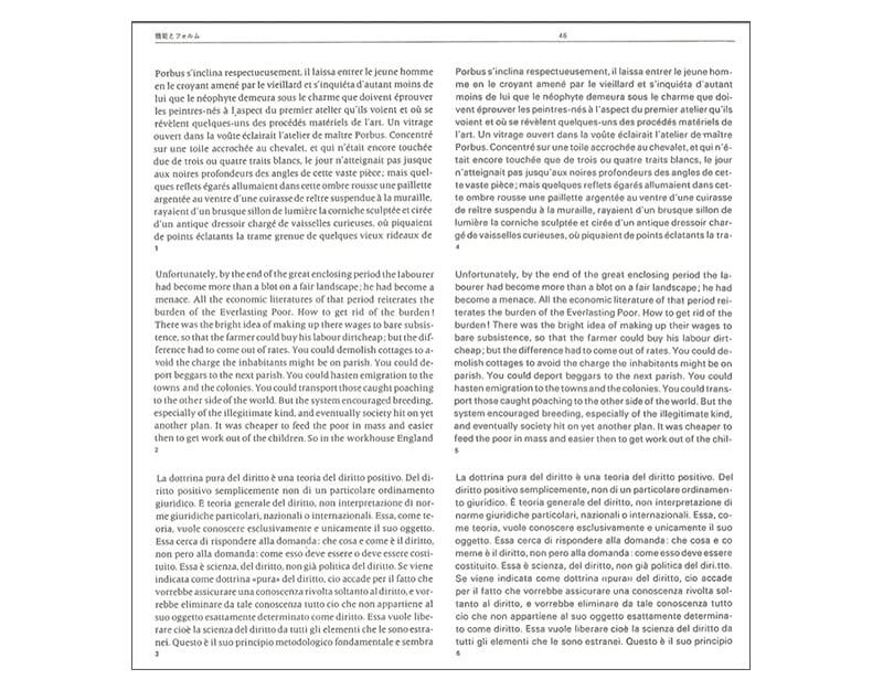 いっぽうユニヴァース活字、おなじくアドリアン・フルティガー設計によるメリディエン活字ではどうか?みてのとおり、言語による濃度差がなく、いずれもムラのないフラットなグレーのボックスがあらわれます。モダニズムの価値基準のひとつは国際的なるもの。ですから、フルティガーによるこうした言語変化の影響を受けず安定した活字書体は、まさに時代がもとめたものなのです。とくにドイツ語、フランス語。ロマンシュ語、英語がもちいられるスイスにおいて、それは切実な課題だったと想像します。さきほどのページとあわせて、フォトショップでガウスをかけたものをみてみます。どうでしょう?より明快にそうした傾向が見て取れるでしょう。