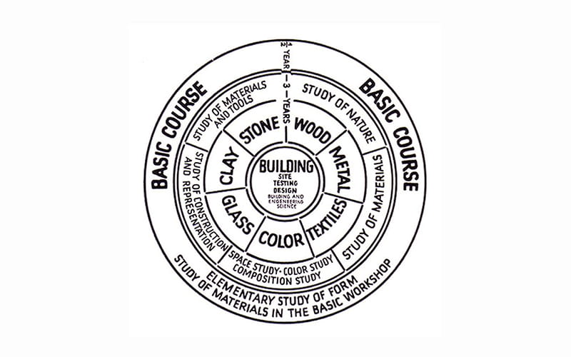 1919年に開講したバウハウス。ここは近代デザインにおける初期の教育機関です。そこに関係した人物が様々なものをデザインしていきます。鉄パイプを曲げただけの椅子とか、装飾や図版がなく、文字だけで表現した広告物、書籍など。これは当時のバウハウスのカリキュラムですが、ここでモダニズムの教育体系が芽生えたいうことですね。これは真ん中に行くにしたがって時間軸が進んでいくというもので、最終的な目標は建築物をつくることになっている。そこに至るまでにいろいろな基礎課程をやっていくんです。途中に素材のワークショップとかがあるわけですが、泥や石、木からメタル、グラスといった工業素材が入ってきているところも、1919年以降にできた学校らしいといえます。