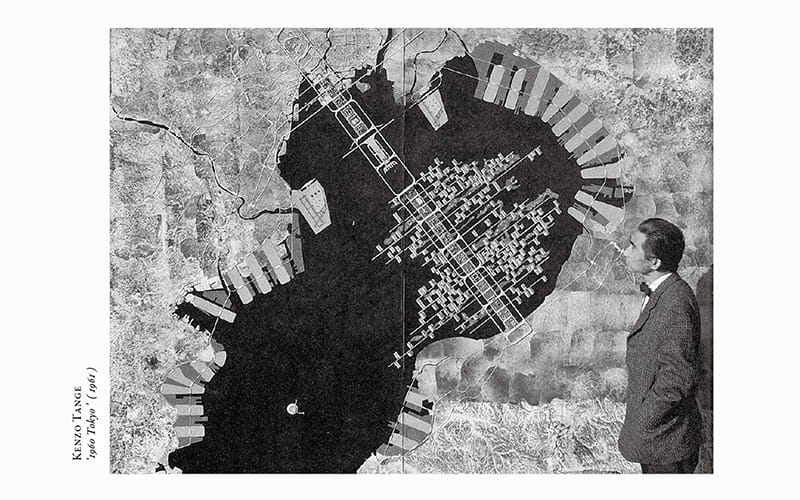 そのあと、より大きな規模になって、モダニストたちは都市計画にも熱心になっていきます。これは1960年の『東京計画1960』という、丹下健三が当時の建築家と、彼がいた大学のゼミ生でつくったプランなんですが、街全体というか、都市をつくっていこうという発想ですね。そうした意味では、最初からインターナショナルな方向に向かっていたし、産業革命以降の物量もスピード感もある時代のなかで、都市規模でデザインを捉えていくという、大きな捉え方をしています。地図を見つめるこの写真のように、神が民衆を見下ろすような目線でデザインを考えていたんだじゃないでしょうか。