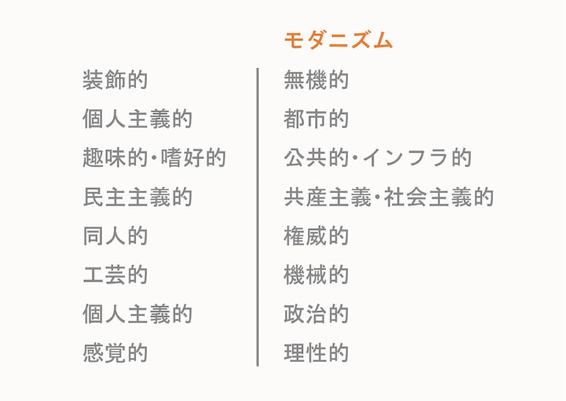 生活に根ざしているというところですね。だから、どちらかというとモダニストは理念で突っ走るような人が多い印象なんですよ。すごく理性的なんだけれど、行きすぎた合理性を求めたり、また功利主義的なところがあって、一部の人たちを置いてけぼりにするような暴力性を感じます。