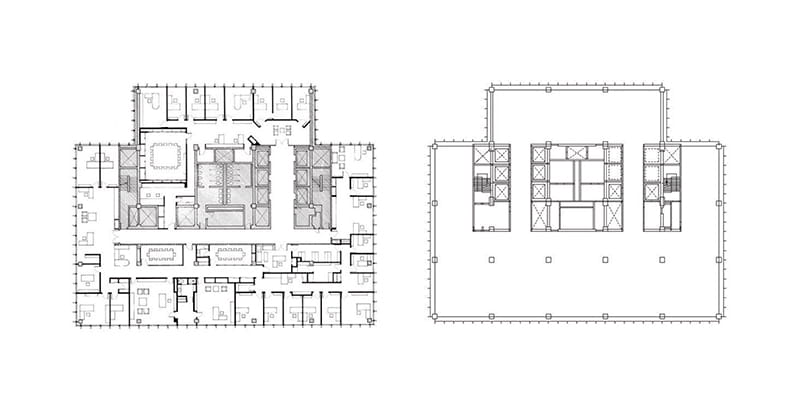 ちなみにグリッドシステムは建築物で考えるとわかりやすいかもしれません。同じ建物の違うフロアの平面図をみてみます。こうした建築物はまさに柱と梁にとるグリッドで何十階と建てられる。必然的にすべてのフロアの構造は同じ状態になりますが、そこにおける機能や意匠は目的により適宜変化させられる。そうした制約のなかでの自由がおこる。この塩梅がまさにグリッドシステムといえるかもしれません。