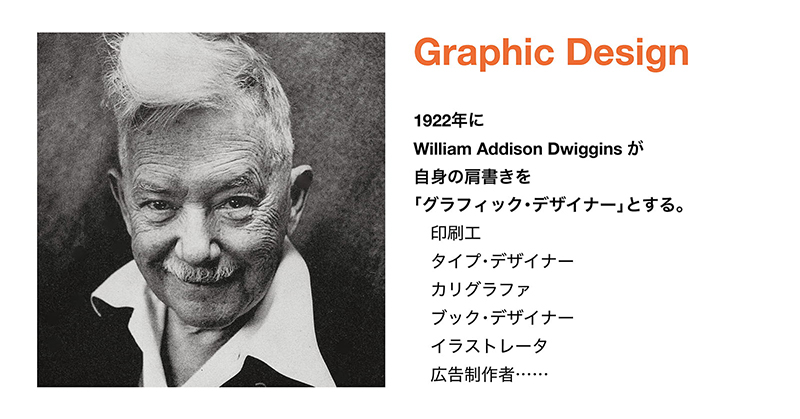 実はグラフィックデザインというのは新しい言葉です。諸説あるものの、ウィリアム・ドゥイギンスというアメリカ人が1922年に自身の肩書きをグラフィックデザイナーとしましたことにはじまるといわれていたりします。この人は印刷工でありながら、カリグラファであり、タイプデザイナーを兼ねた人物。要するに印刷まわりのマルチクリエイターです。それを総称した言葉が「グラフィックデザイン」であったわけです。ちなみに日本では1960年、世界デザイン会議以降この言葉が普及します。それまでは図案家あるいは商業美術家という肩書きでした。