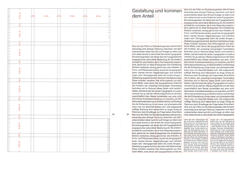 表紙にある朱色の線——英語・ドイツ語版は朱地に白線になります——これが、まさにこの本のグリッドシステムになっています。縦に4分割、水平方向に8分割という設計です。これをつかえば、一段組はもちろん、二段組、四段組もできる……と作例を交えながら、本文で解説されています。テクストも図版も余白も。同じグリッドのなか規格化され、等価として配列されています。スイススタイル・タイポグラフィの特徴として、大胆な余白づかいが印象的ですが、グリッドがあるから思い切りの良いスペースの扱いができるのかもしれません。