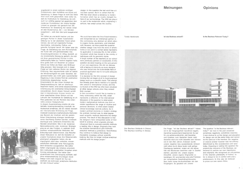 こちらは同時代、1963年に発刊されたウルム造形大学の紀要です。これを例にグリッドシステムがどんなものか見てゆきましょう。教育機関の紀要でありながら、雑誌のようにページごとにレイアウトが変化しています。一見すれば全然違うものですが、よくみれば何かしら整合性があるようにもみえる……というよりも、整合性があるから今回、資料として持ってきているのですが(笑)この書物で扱われるテクストなり、図版なり、余白はいずれもグリッドシステムのうえで等価的に展開されています。