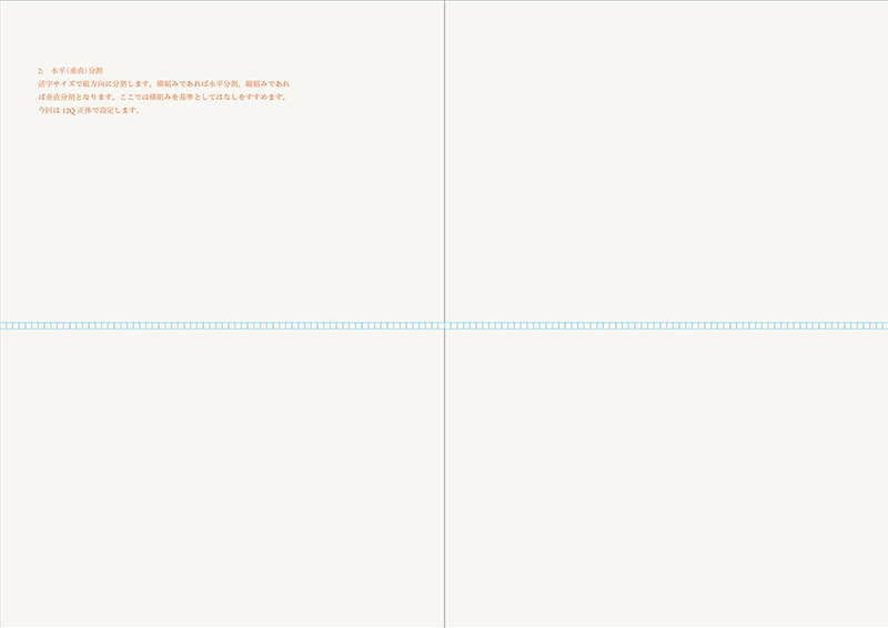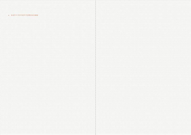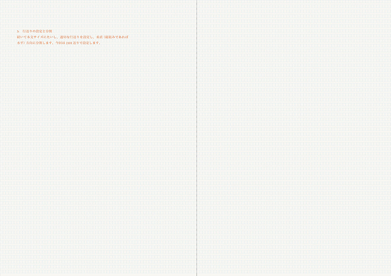 この作例では本文サイズを12Q(3mm) / 行送りを21H(5.25mm)とします。ひとまずは画面の水平方向を3mmピッチで分割します。それから画面の垂直方向を5.25mm刻みで割ってゆく。初期段階ではこうして専用の方眼紙ができるような状態にします。ちなみに縦組みであればこの水平垂直の関係は反転しています。この時点ではまだグリッドシステムとはいえず、活字サイズで画面を分割しているにすぎません。これをふまえ目的にあわせた設計とし、それにともない必要な分割線をあたえることで、グリッドシステムが成立してゆきます。