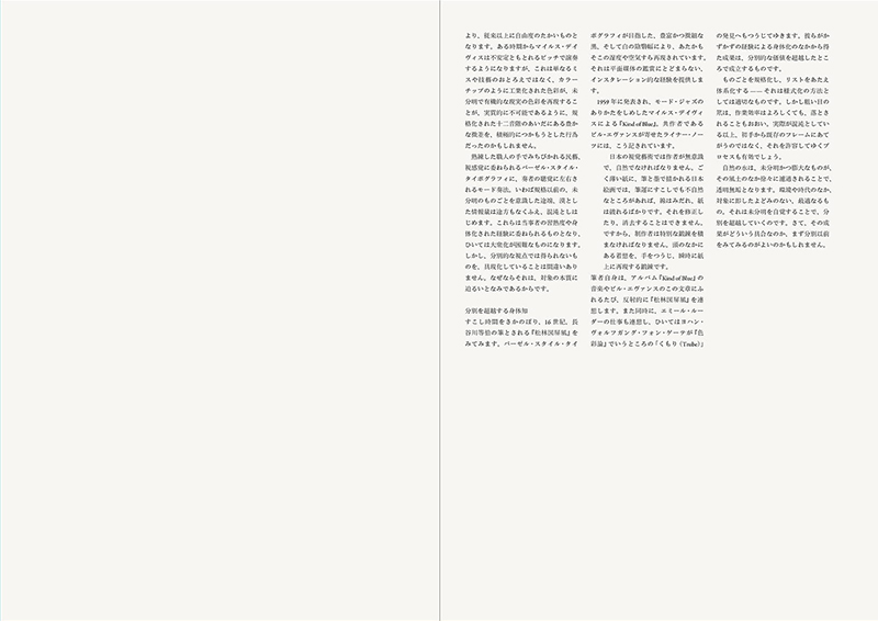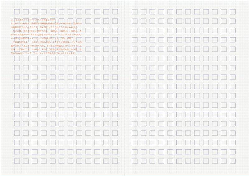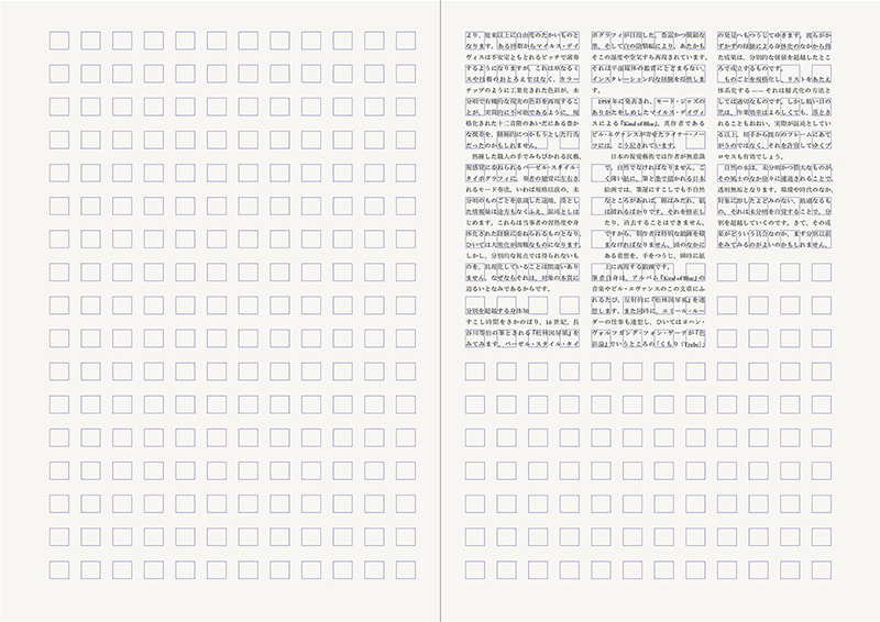 印刷術は活字を置いていくので、欧文であればそれが自然と横に伸びていきます。そして行としては、縦に積み重ねられていくという、縦横の力学がある。これが絶対の公理で、それが無限に形成されていく宇宙だと。こんな言われ方がされることもあって、タイポグラフィを考えることは自ずとグリッドを考えることになっていきます。紙面はサイズが決まっているので、グリッドを微分的に割って導きだしていくと、一応限界があるわけです。もうひとつのみかたとして、文字を積み上げるように導きだしていく方法がある。これは微分に対して積分という感覚で、この両方の視点でつくっていくものがグリッドだといえます。