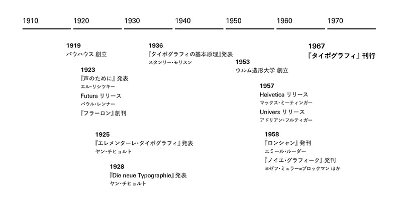 そうです。時代背景も影響しているのでしょうが、チヒョルトはバーゼルに限らずおおくの拠点移動がありますし、その推移が作り手としてのスタイルのちがいを象徴しているようにもみえます。さて、バウハウスの創立1919年をはじまりとして、1967年の『Typographie』発刊までのあいだ、タイポグラフィ界隈でおこった重要事項を年表としてまとめてみました。やはり第二次世界大戦前後で様相が変化しています。1923年はリシツキー『声のために』発刊、パウル・レンナーによるフーツラ書体リリース、そして『フラーロン』誌創刊と、戦前の当たり年といえます。いっぽう戦後では1957年にヘルヴェチカとユニヴァースがリリースされ、翌年にはブロックマンらによる『ノイエ・グラフィーク※11』やルーダーによる『ロンシャン※12』と、スイスタイポグラフィを象徴する書物が刊行されています。戦前はアヴァンギャルドであり、アジテーション的な性格をもった造形運動が、戦後の時間のなか、ヴィジュアルコミュニケーションにおけるインフラストラクチャとよべるような、社会基盤として整理・洗練、そして体系化されていきます。