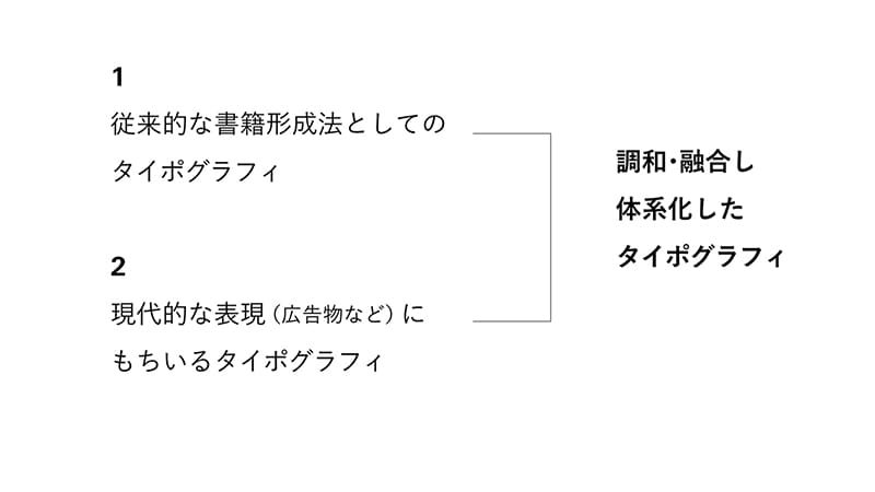 1:従来的な書籍形成法としてのタイポグラフィ 2:現代的な表現(広告物など)にもちいるタイポグラフィ