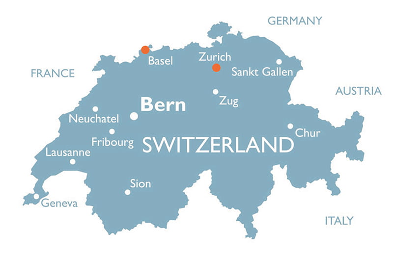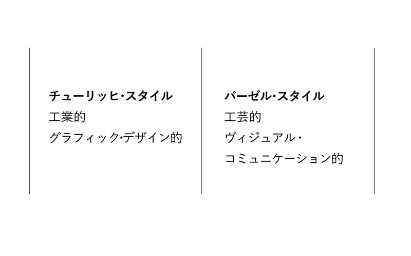 さて、スイススタイルのタイポグラフィは、いっけんすれば似ているものの、そのなかで「チューリッヒスタイル」と「バーゼルスタイル」と、おおきくふたつの潮流が存在します。それぞれスイスの都市の名前です。地図をみてみますと、ともにフランスやドイツに隣接しており、位置関係としてはそんなに離れてはいませんが、バーゼルがフランス寄り、チューリッヒがドイツ寄りという具合です。
