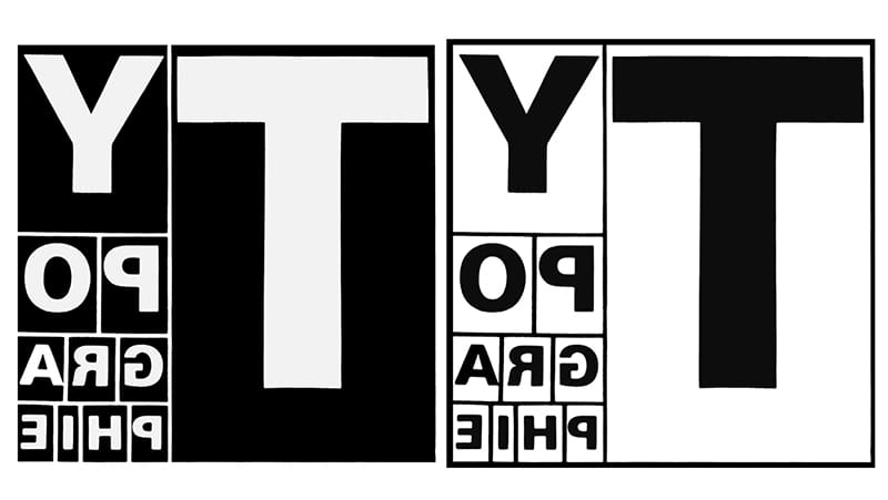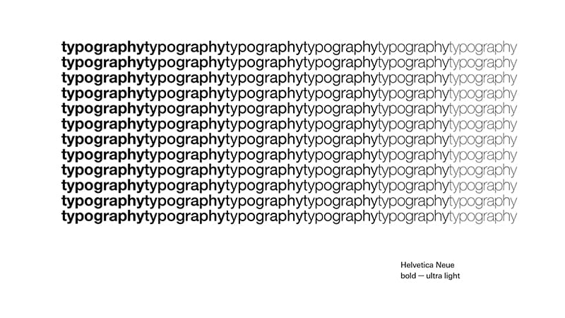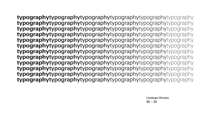 一見すれば似ているヘルヴェチカとユニヴァースですが、ヘルヴェチカはチューリッヒ派の代名詞、そしてバーゼル派にとってそれはユニヴァースであり、彼らにとってそれぞれが最適化された活字書体でした。こうしてフォルムとカウンターを反転させると、ユニヴァースは黒と白が等価に設計されていることがみてとれます。ユニヴァースの特徴のひとつは、精巧なウェイトコントロールがなされていることにあり、それがゆえ高精度な刻みをもつグラデーションを再現することが可能です。
