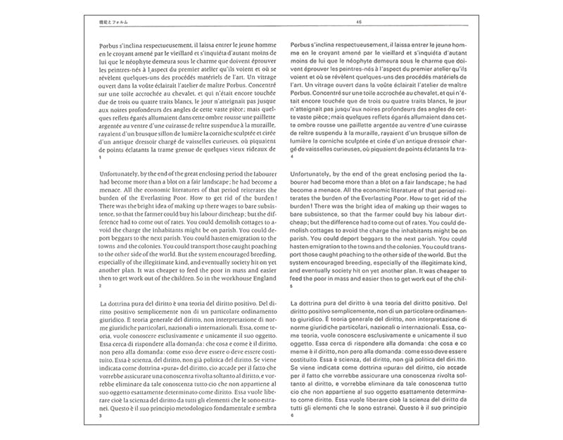 こうしてヘルヴェチカのグラデーションと比較すると、その段階のスムーズさが際立つことでしょう。ヘルヴェチカの元となったアクティデンツグロテスクは、おおきなサイズでもちいることを前提としたディスプレイ書体ですが、ユニヴァースは設計者であるアドリアン・フルティガーの弁によれば、ニコラ・ジェンソンによるローマン体の骨格をもちます。こうして比較すればユニヴァースの組版テクスチャは、まさにジェンソン・ローマンそのものです。それは近代的解釈された本文活字書体であるともいるでしょう。ユニヴァースは「見る」ために発展したサンセリフ体としての側面と同時に、伝統的な「読む」ための活字としての側面を内包しています。こうした活字書体を採用したところにも、バーゼル派がニュータイポグラフィ的なる造形の根底に、従来的な書物形成法としてのタイポグラフィを基盤と持つことがわかります。