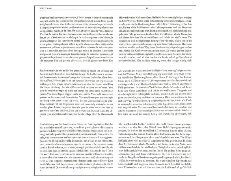とはいえ、ここでユニヴァースやメリディエンを無批判に礼賛したり、あるいは発生した国の活字書体をつかえ、というような厳格めいたはなしは、あまりに早急すぎますし、ナンセンスです。そればかりが活字書体の選択基準にはなりえないでしょう。しかし、活字はながい時間のなかで、どうしても言語や地域風土に最適化されるものであるというのは、間違いないようですし、それはかんがえてみれば当然のことかもしれません。その背後には最適化されるほどの時間があり、それがゆえ今日もなお残るもの。