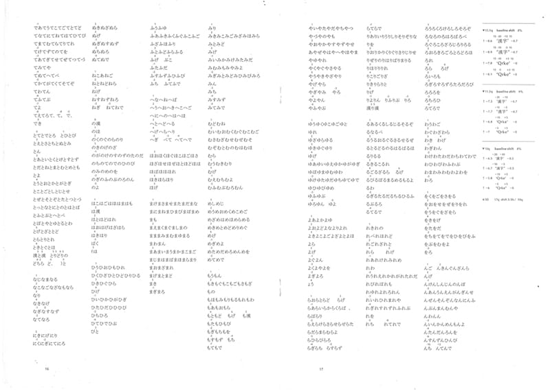 いっぽう、日本語を読む際、漢字と和字の濃度差が可読性を導いていることも事実です。そして表層化はしないものの、どこかで正方形のリズムを意識しながら読んでいるかもしれません。音楽でいえばメロディを聴きつつも、その基礎単位たる音符や休符の周期を意識している状況ともにているといえます。もちろん字形や書体の種類によっては、完全な正方形のグリッド揃え、というよりもゆらぎがあったほうが自然にみえる場合も、当然、存在します。シーケンサーと名手のドラム奏者のちがいともいうべきか。ですから単純に機械的なグリッドを礼賛するつもりはありませんが、言語特性、システム特性により固有の一定のリズムが、脈々と続くことは、また事実でしょう。それは、和文組版においては、正方形のリズムを基礎とし、その濃度差のうえでテクストをよむことにあるといえる。清原悦志による北園克衛『BLUE※23』の本文組版などは、その好例といえるでしょう。こうした傾向は2000年を過ぎたころから、日本語とその組版システムの特性をふまえた可読性に基づいたものに変化をしてゆきます。それはいわばオブジェクトとしてのタイポグラフィから、読む文章、文字情報としてのタイポグラフィへの変化であり、原点回帰とみることができます。