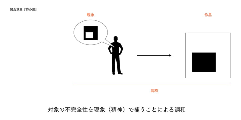 ルーダーの方は、自分のなかに現象という精神的な形があって、それが射影されたものが作品という話でした。それに対して、茶の湯の考え方というのは、茶室に何かが置いてあったとしたら、それを見た自分の心で置かれたものの周囲にある余白を補って、それが目の前で調和するというのが『茶の本』で言われていることです。結構言ってること違ってておもしろいんですが、これは言語の違いなんだと思いました。ラテン語のように主語がしっかりあるか、日本語のように主語が曖昧か、その違いが現象の捉え方に影響してそうな気がします。